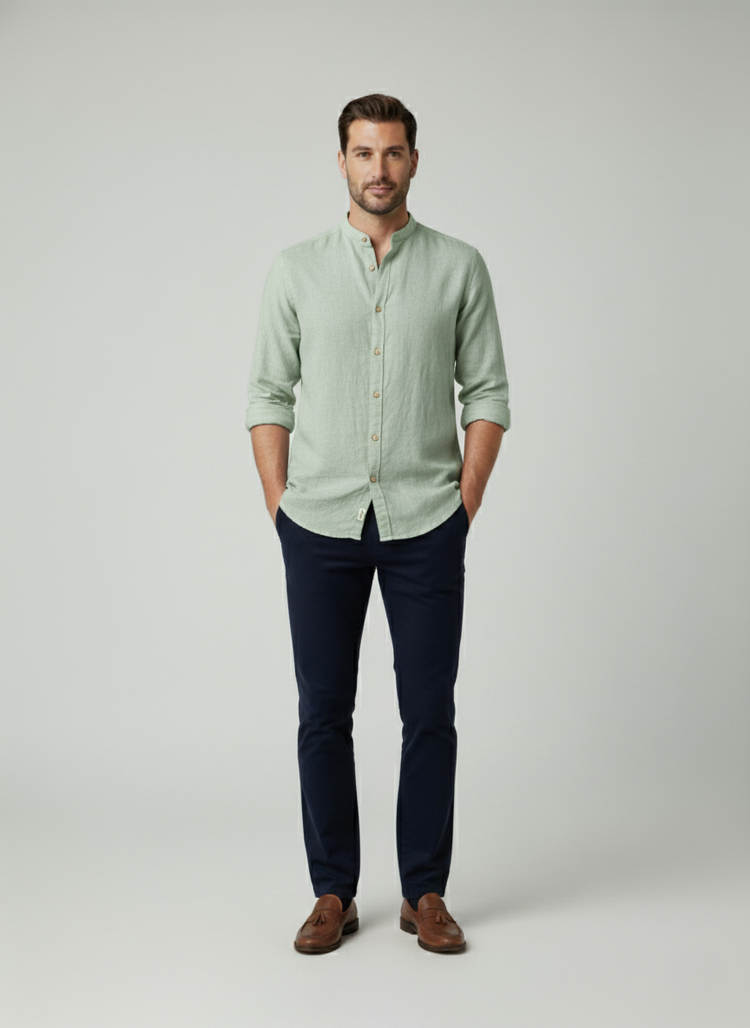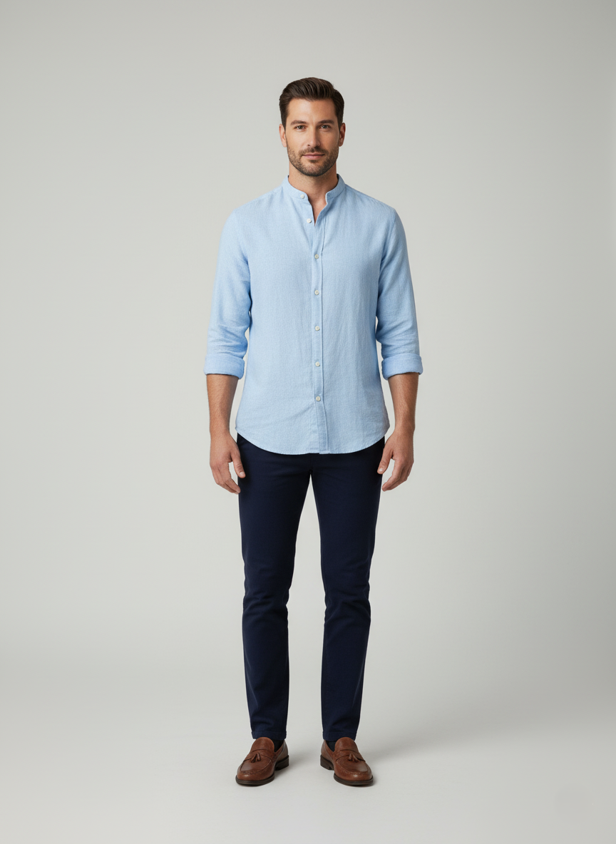 A staple of the truly sophisticated wardrobe. The Cambridge Band Collar Shirt is the epitome of quiet confidence and timeless style. It’s a versatile masterpiece that speaks of Ivy League libraries and breezy rooftop socials, designed for the man who appreciates precision in every detail.