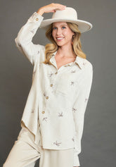 Experience the superior comfort and breathability of its premium 55% Linen and 45% Cotton blend. This all-natural fabric feels exquisitely soft against the skin and offers a beautiful, subtle texture. The classic button-front shirt is elevated by delicate, all-over ribbon bow embroidery in a contrasting tone, adding a unique and charming point of interest.